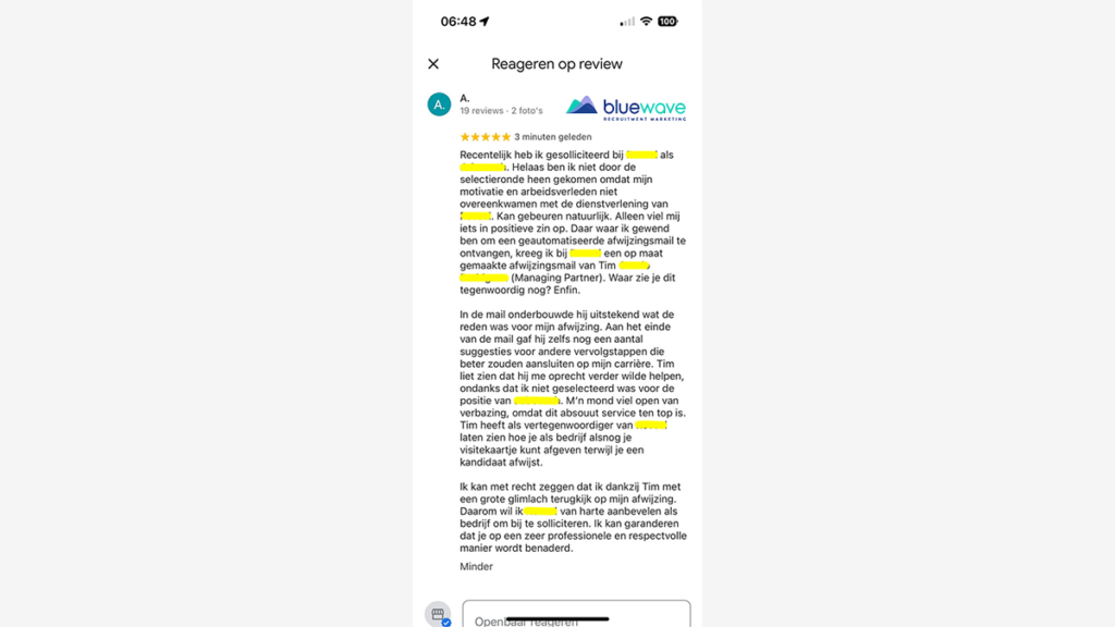 Van eerste klik tot afwijzing of onboarding: iedere stap in de candidate journey is een kans om een blijvende indruk te maken. Houd de reis soepel, duidelijk en menselijk. Denk aan snelle communicatie, eerlijke verwachtingen en persoonlijke opvolging. Zelfs als iemand wordt afgewezen, kan die ervaring zó goed zijn dat ze alsnog ambassadeur worden, of zich in de toekomst opnieuw tot de organisatie wenden (zie voorbeeld hieronder).